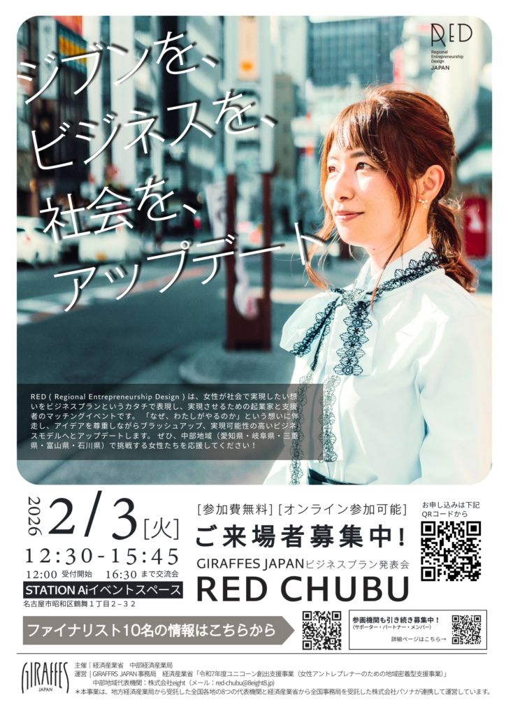 ビジネスプラン発表会RED 2/3(火) ご来場者募集中 最新チラシを掲載しました チラシPDF ビジネスプラン発表会RED ( Regional Entrepreneurship Design ) は、女性が社会で実現したい想いをビジネスプランというカタチで表現し、実現させるための起業家と支援者のマッチングイベントです。「なぜわたしがやるのか」という一人一人の想いを知っているからこそ、アイデアを否定せずブラッシュアップし、その実現可能性を高めるためにビジネスモデルをアップデートします。地域のサポーター・パートナーが継続的な支援を行うことで、女性起業家がライフステージの変化にかかわらず成長し続けるきっかけをビジネスプラン発表会REDで提供します。 ファイナリスト10名の情報はこちらから