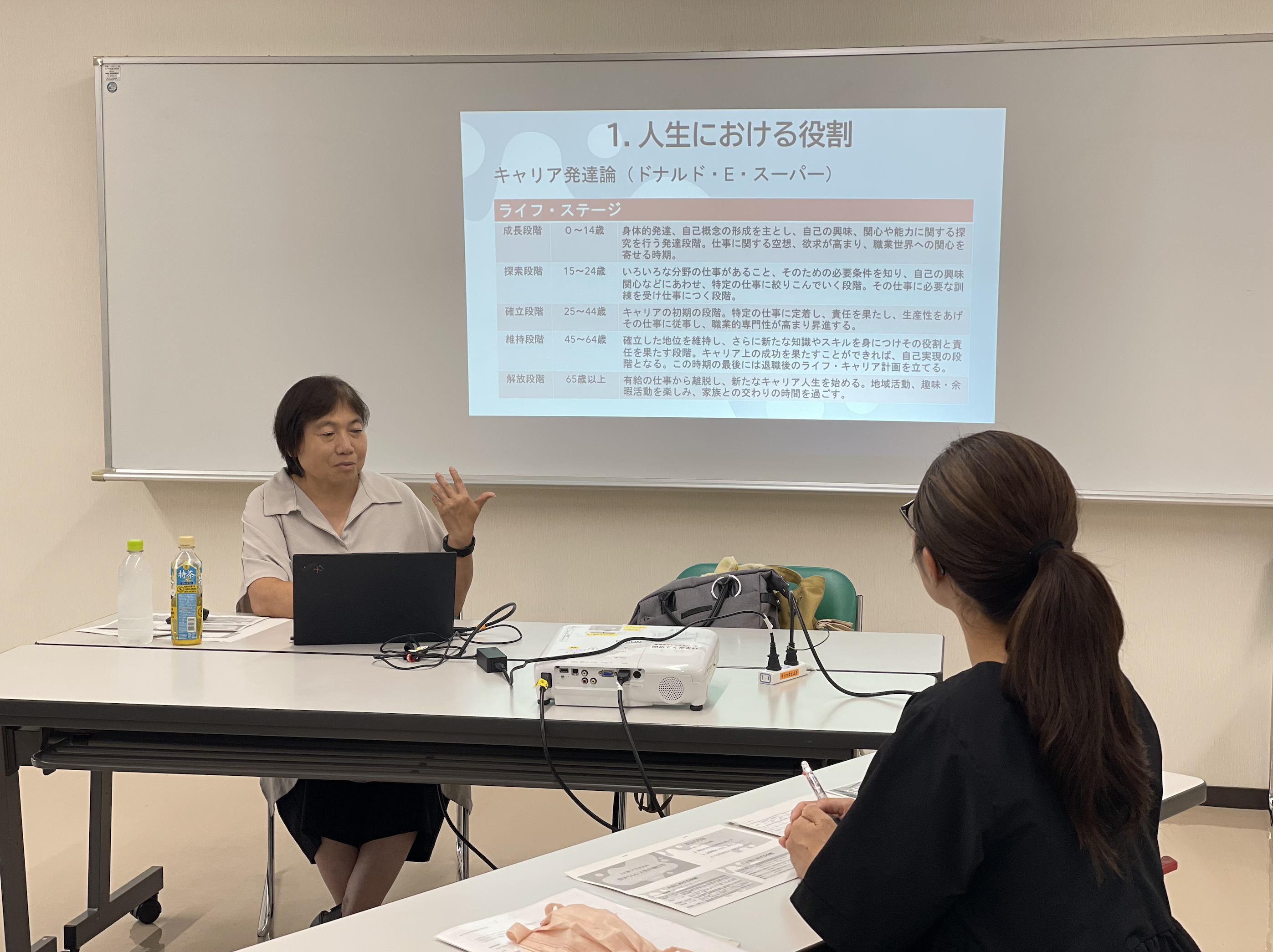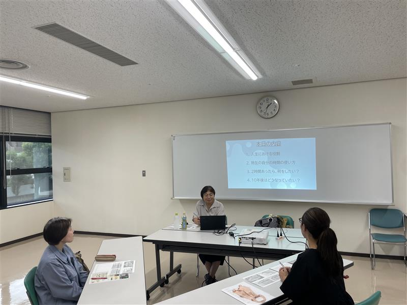 人生にはさまざまな選択肢があり、どの道を選ぶか迷うことは誰にでもあります。今回の講座では、ライフステージの変化にかかわらず、仕事や地域社会で自分らしく成長し続けるために、ライフキャリアレインボーのワークを実施。参加者の皆さんは、人生における役割を振り返りながら、時間の使い方や優先順位を見直す機会となりました。